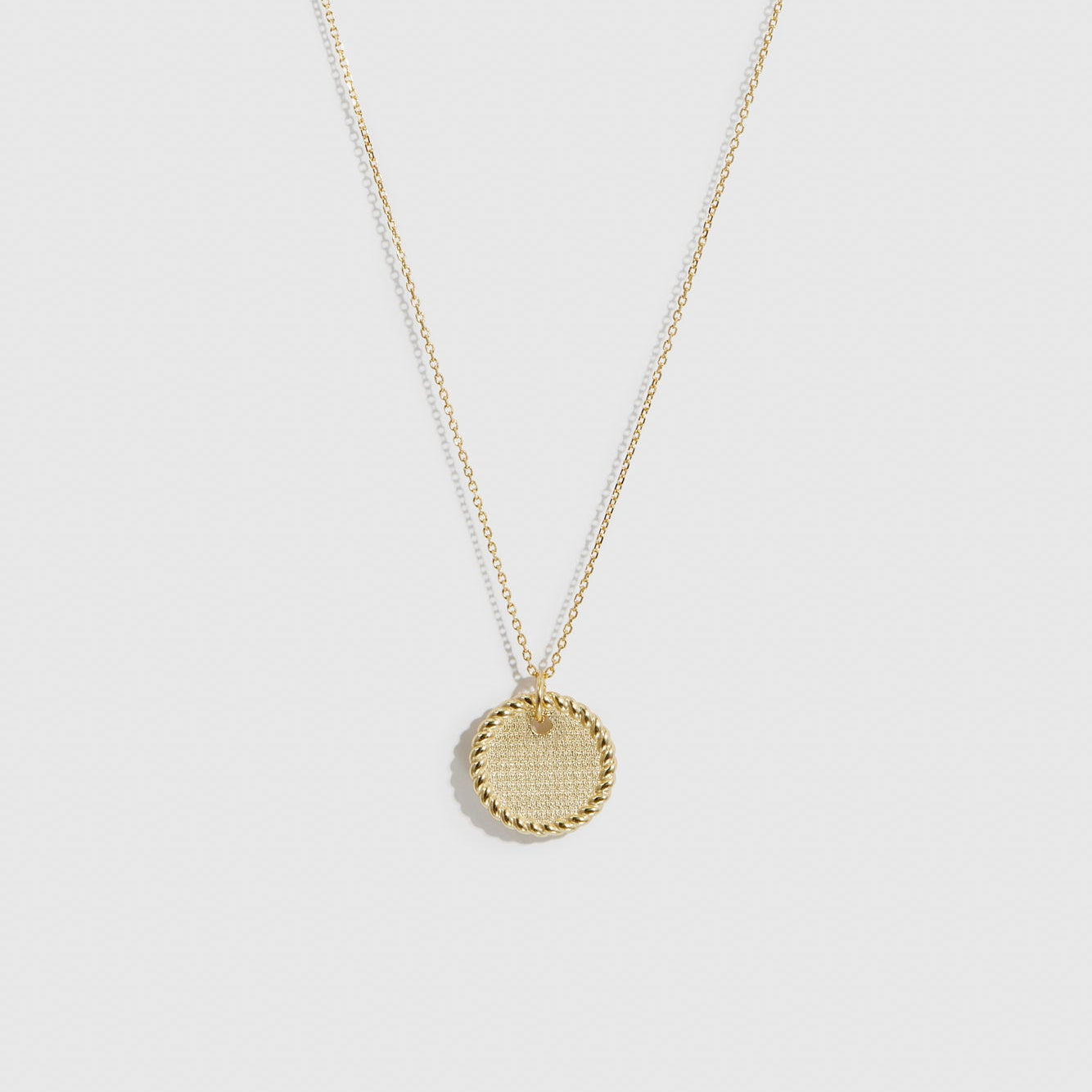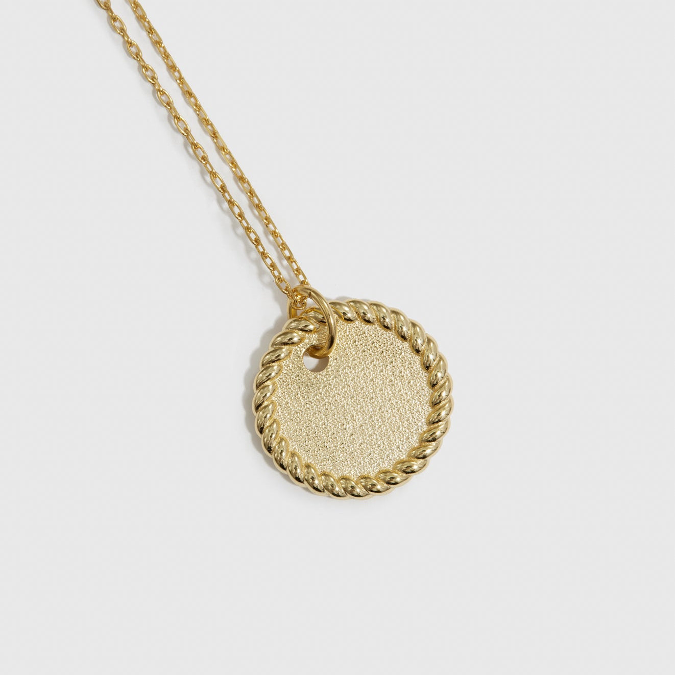 The Braided Outline Circle Pendant features an elegant braided design that adds subtle texture and refined detail.