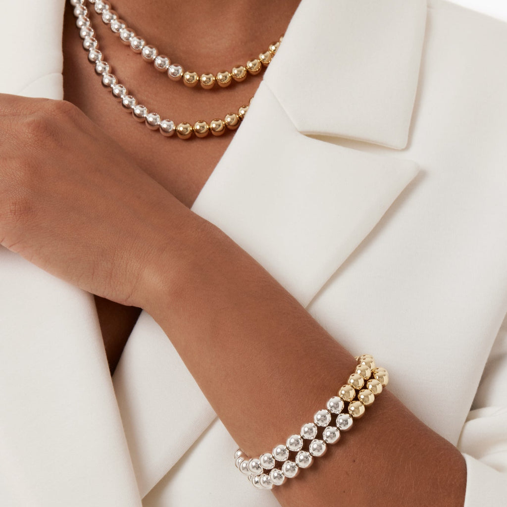 This sophisticated beaded necklace features a stylish mix of metals, blending elegance with modern design.
