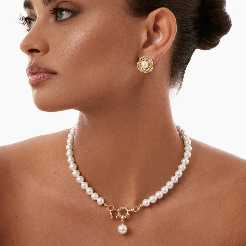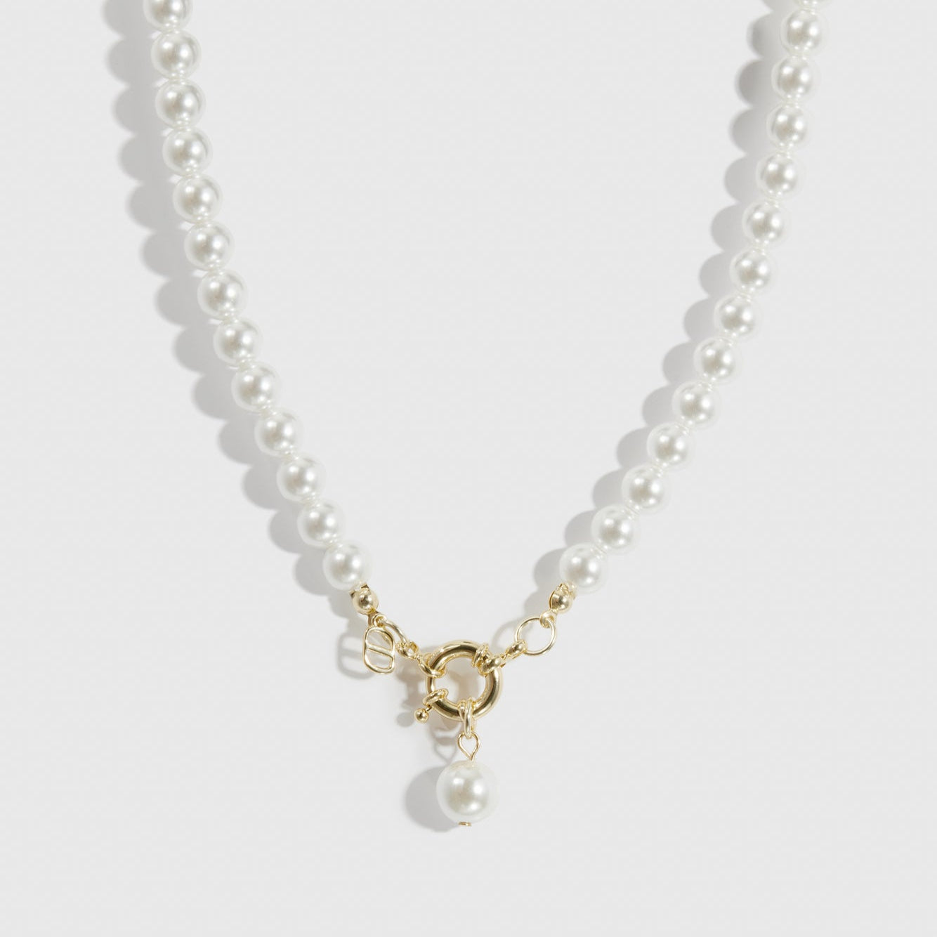 This Single Row Pearl Choker exudes timeless elegance with its sleek design and lustrous pearls.