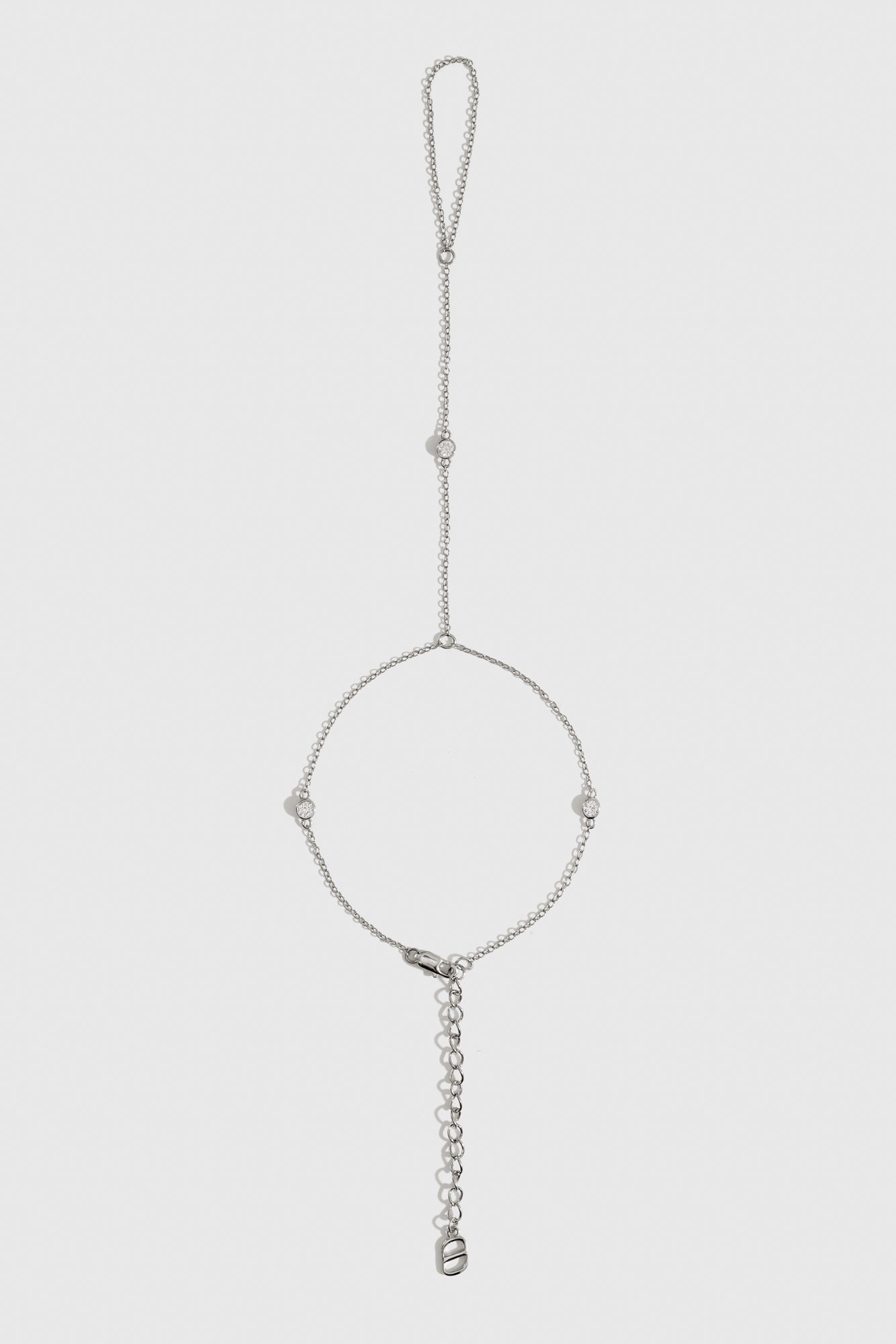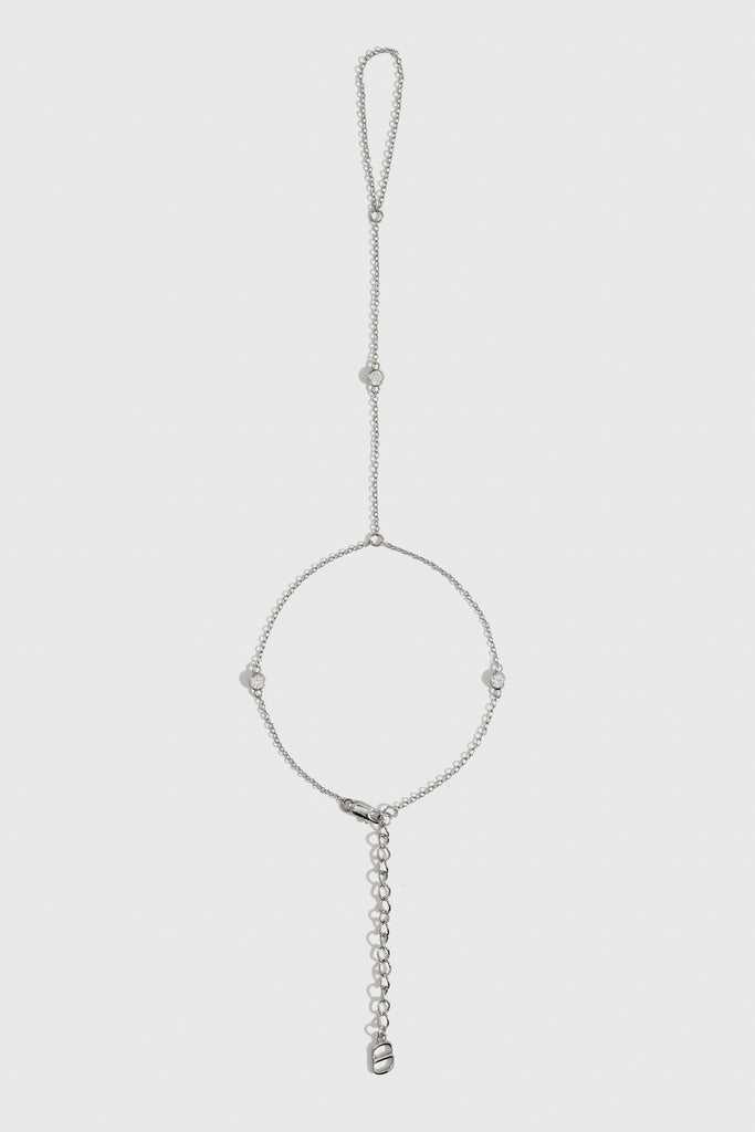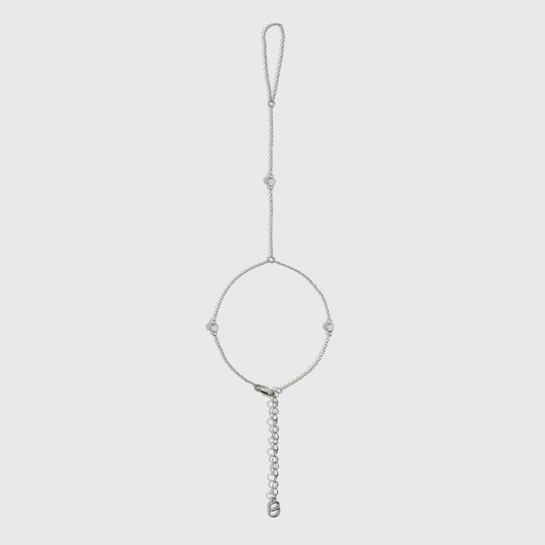 Delight in delicate sparkle with this dainty round-cut hand chain that gracefully adorns your hand with subtle shine. Its simple design adds a touch of elegance and playful charm, perfect for elevating any look from casual days to special evenings.