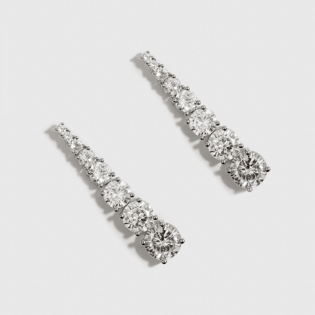 From delicate chains, luminous round-cut stones descend in graceful arcs, capturing light with refined precision. These Round-Cut Drop Earrings embody understated luxury—a perfect complement to both minimalist and layered jewelry aesthetics.