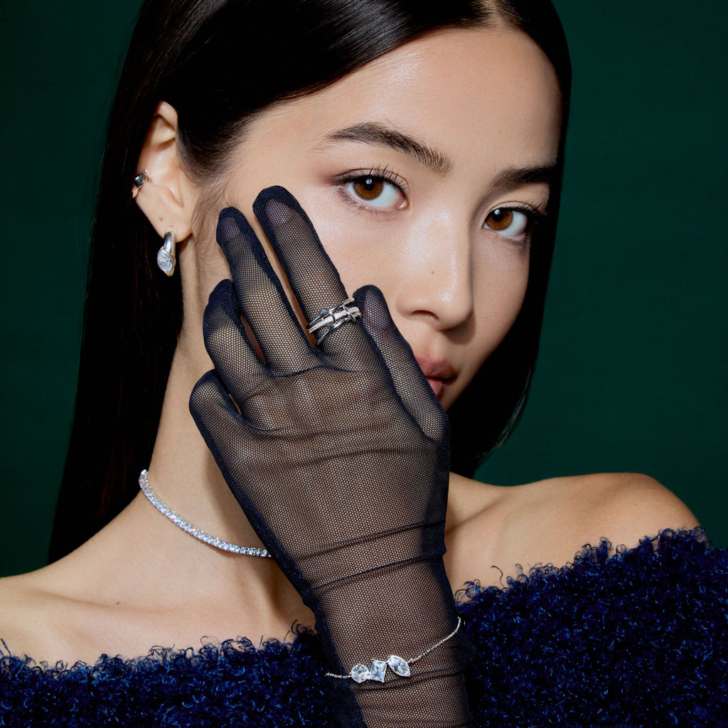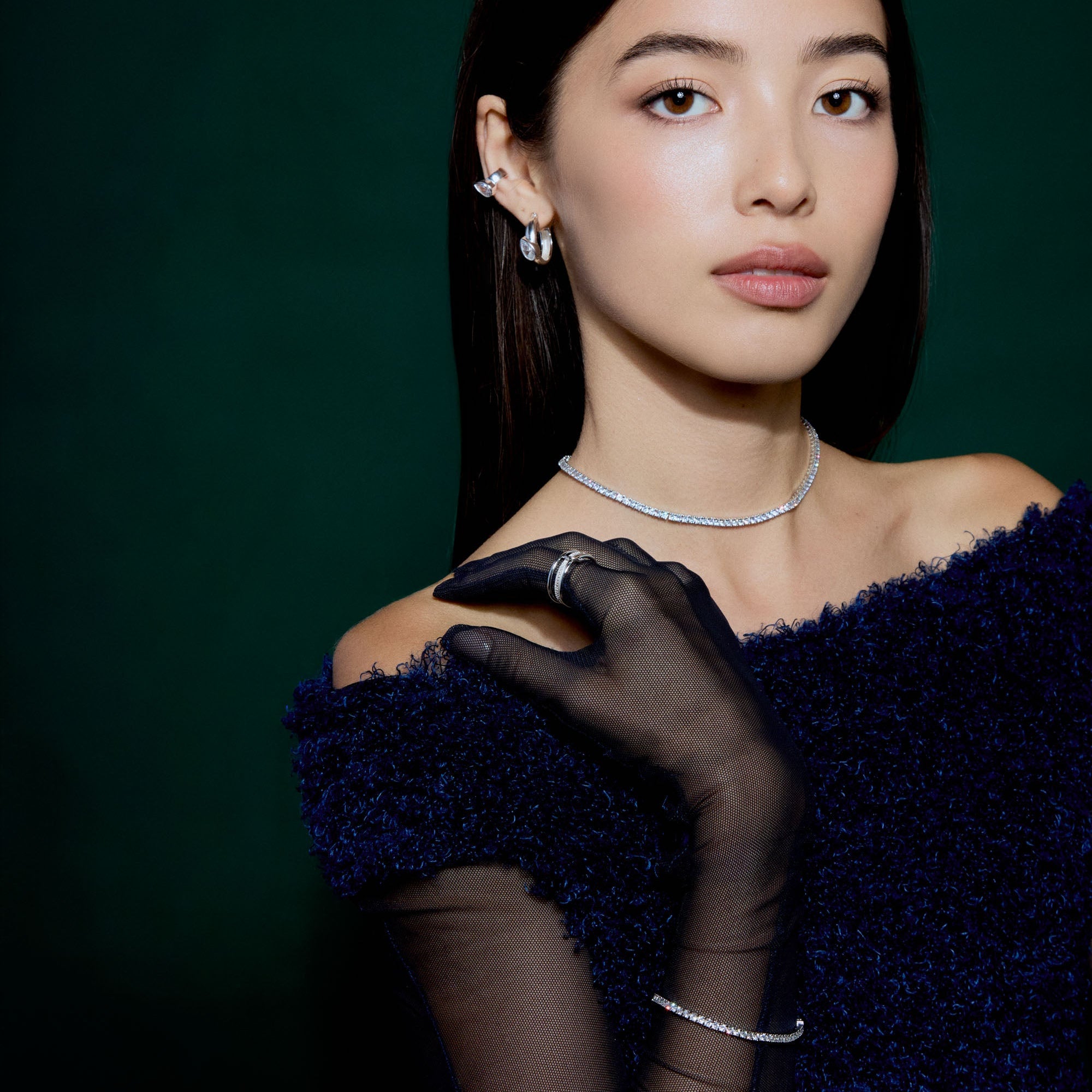Its slender silhouette features brilliantly set stones in a continuous strand, creating a sophisticated statement at the neck.