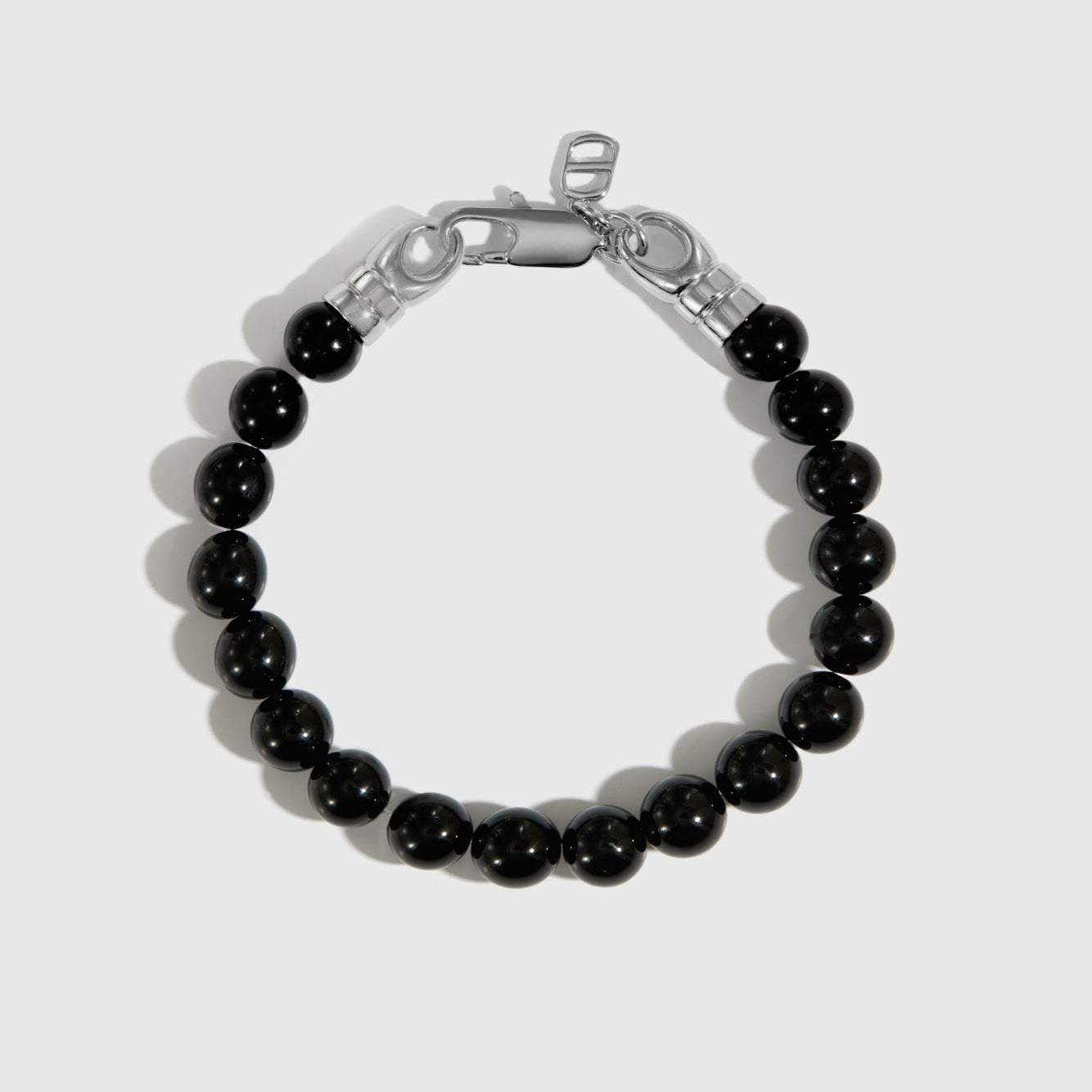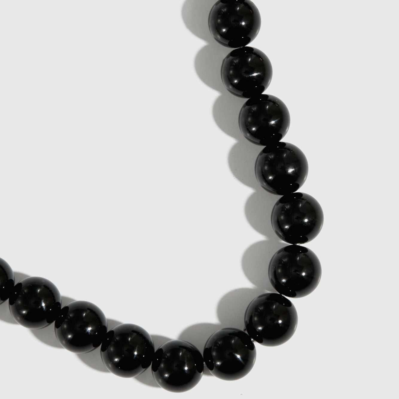 The beads are made from polished Black Agate gemstones, offering a smooth finish with a naturally refined shine.