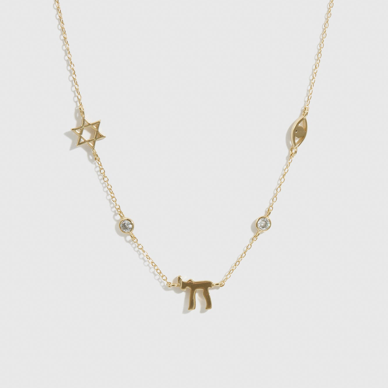 A refined necklace uniting the Star of David and Chai symbol in delicate form.