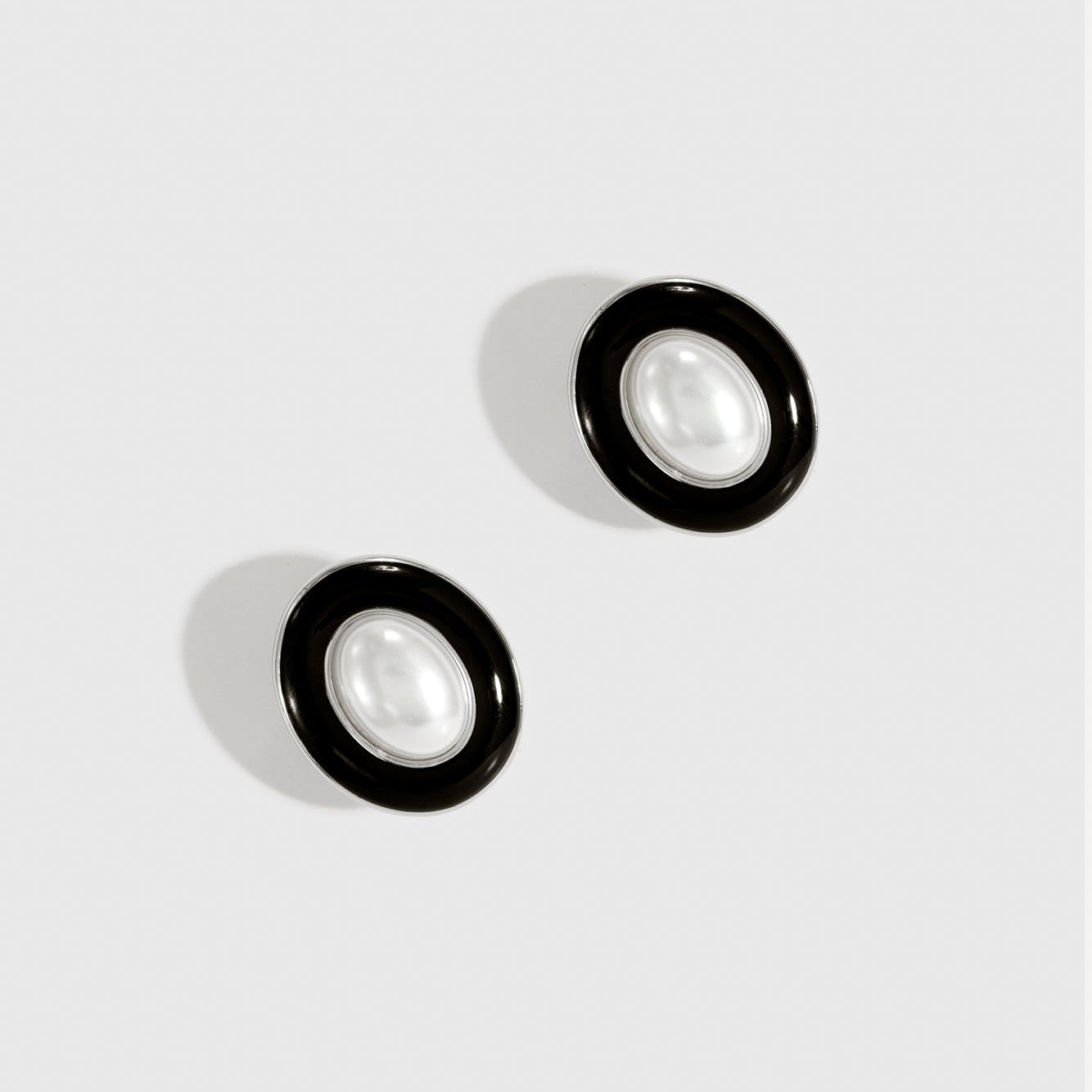 Showcasing an elegant feel, these stud earrings are composed of black enamel and a glass pearl.