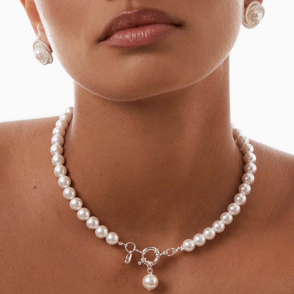 This Single Row Pearl Choker exudes timeless elegance with its sleek design and lustrous pearls.