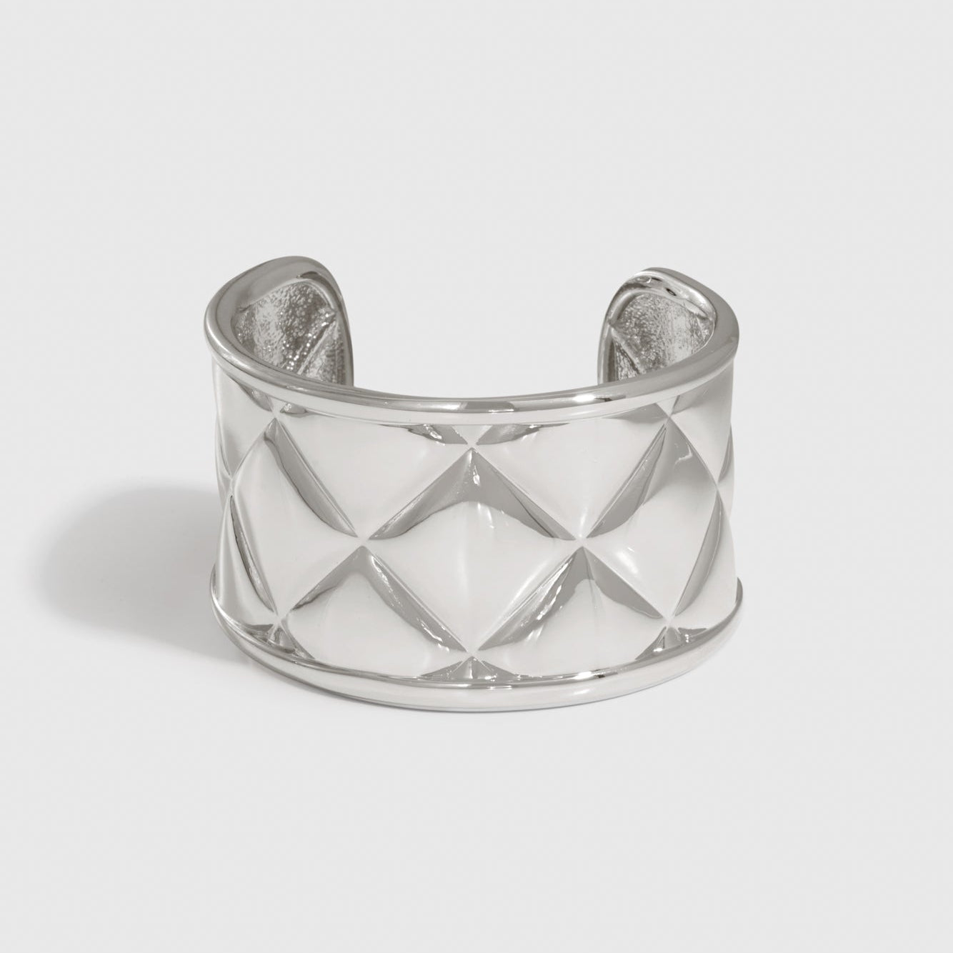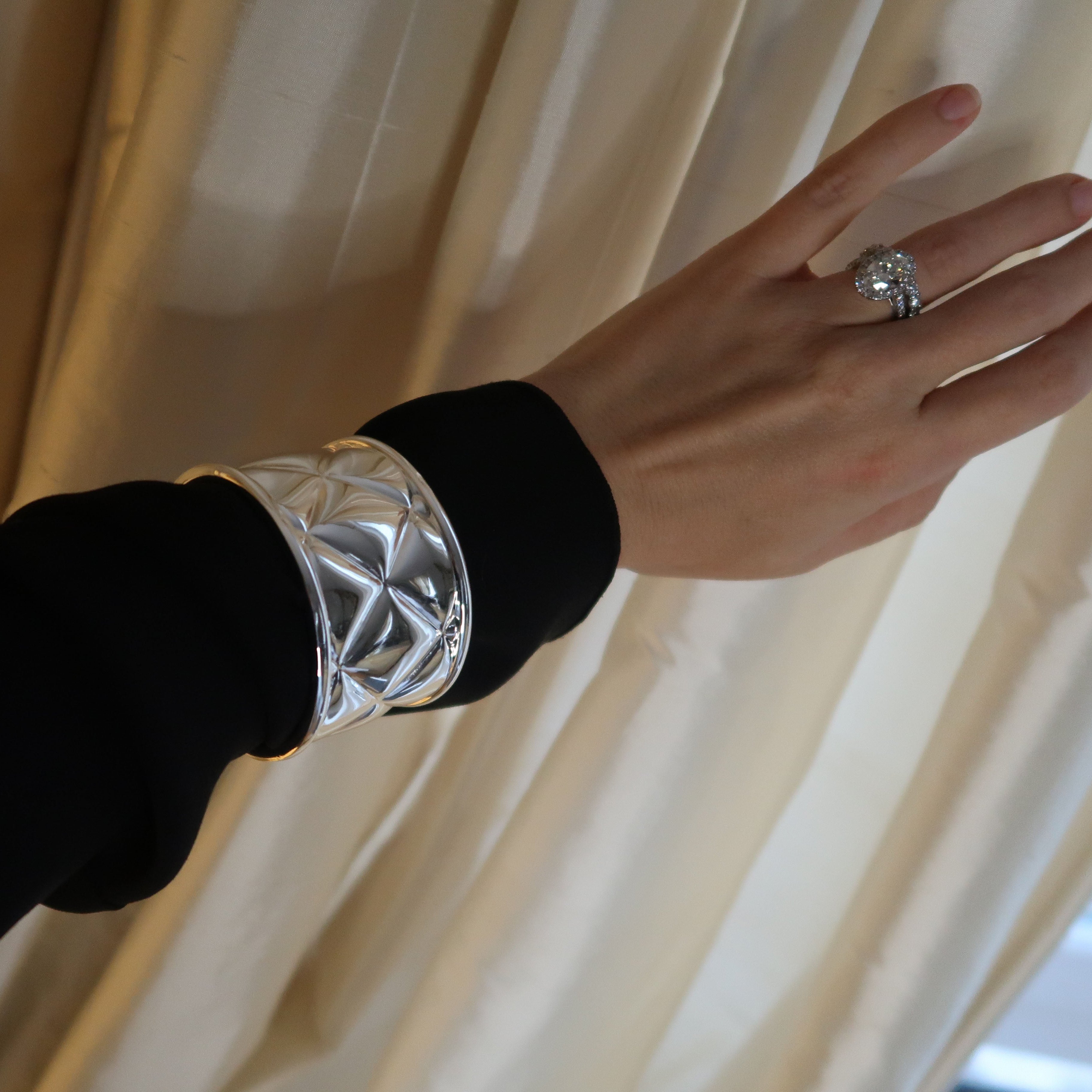 S'inspirant de l'élégance classique du matelassage, ce bracelet rigide présente une texture entrecroisée qui lui confère un look à la fois intemporel et moderne.