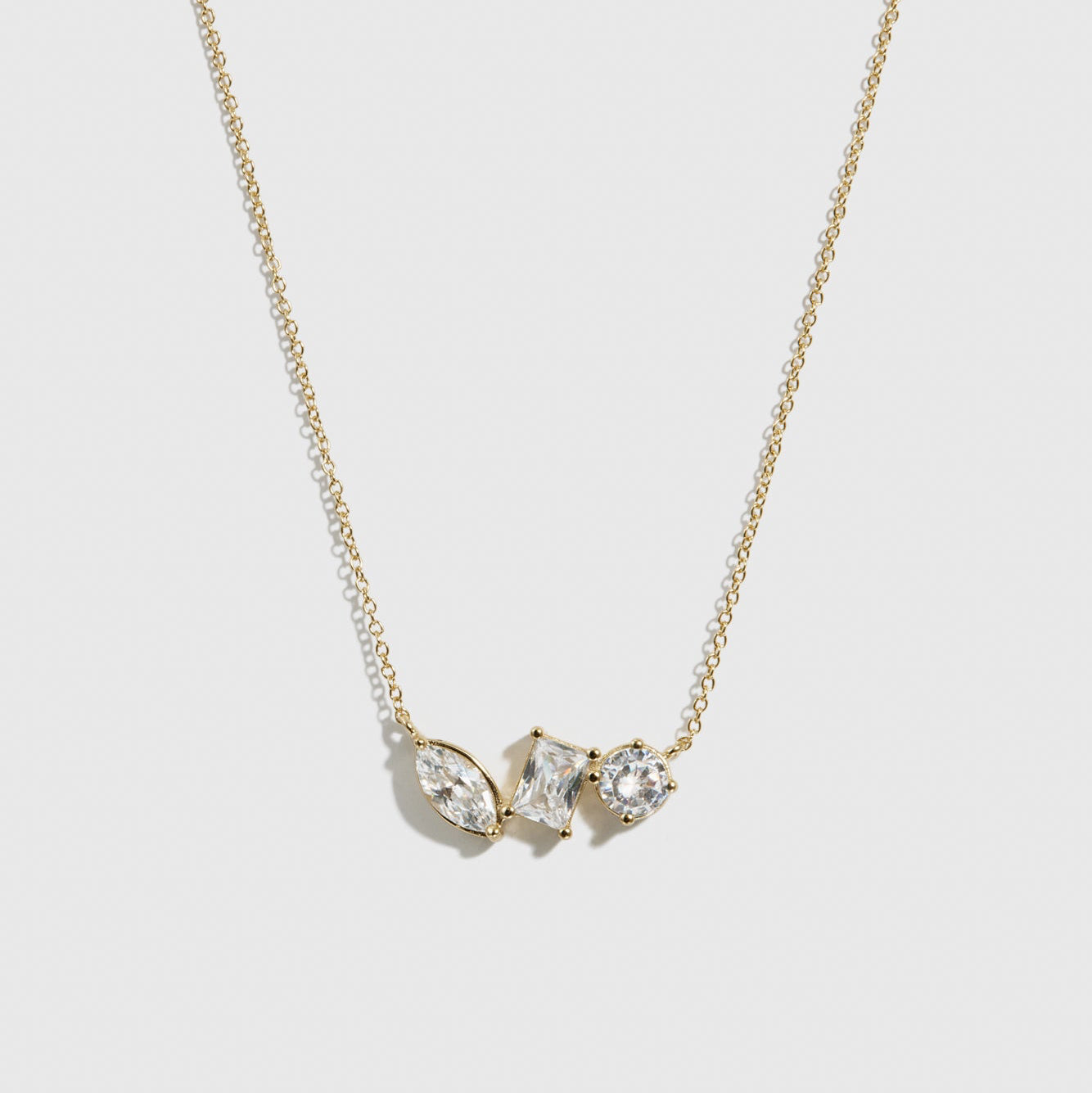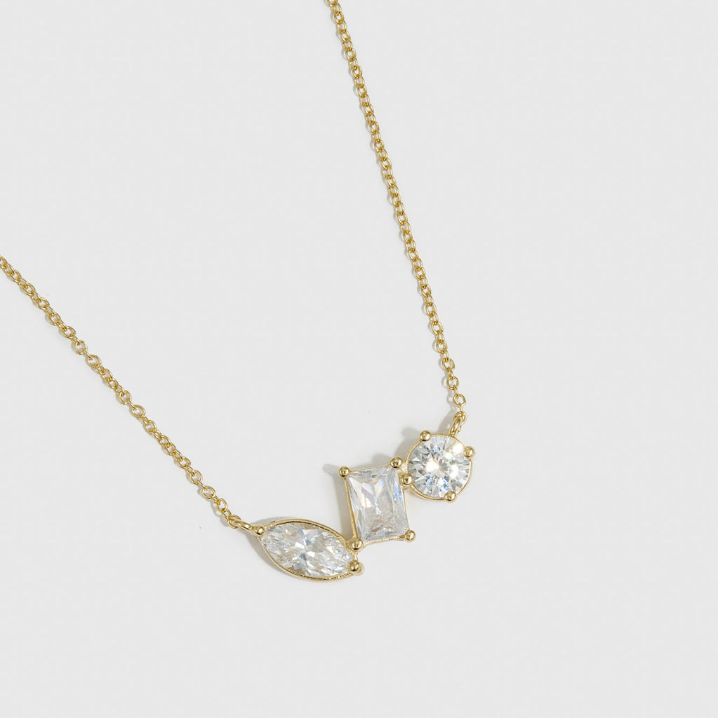 Composé de trois éléments géométriques délicatement taillés suspendus à une chaîne gracieuse, ce bijou offre un équilibre parfait entre design minimaliste et sophistication subtile.