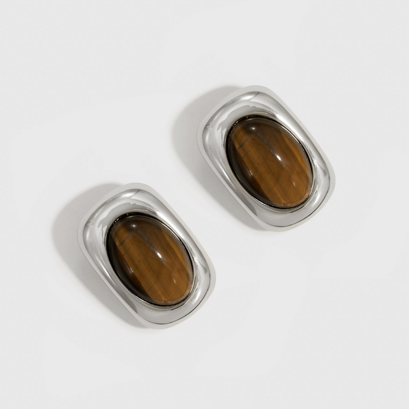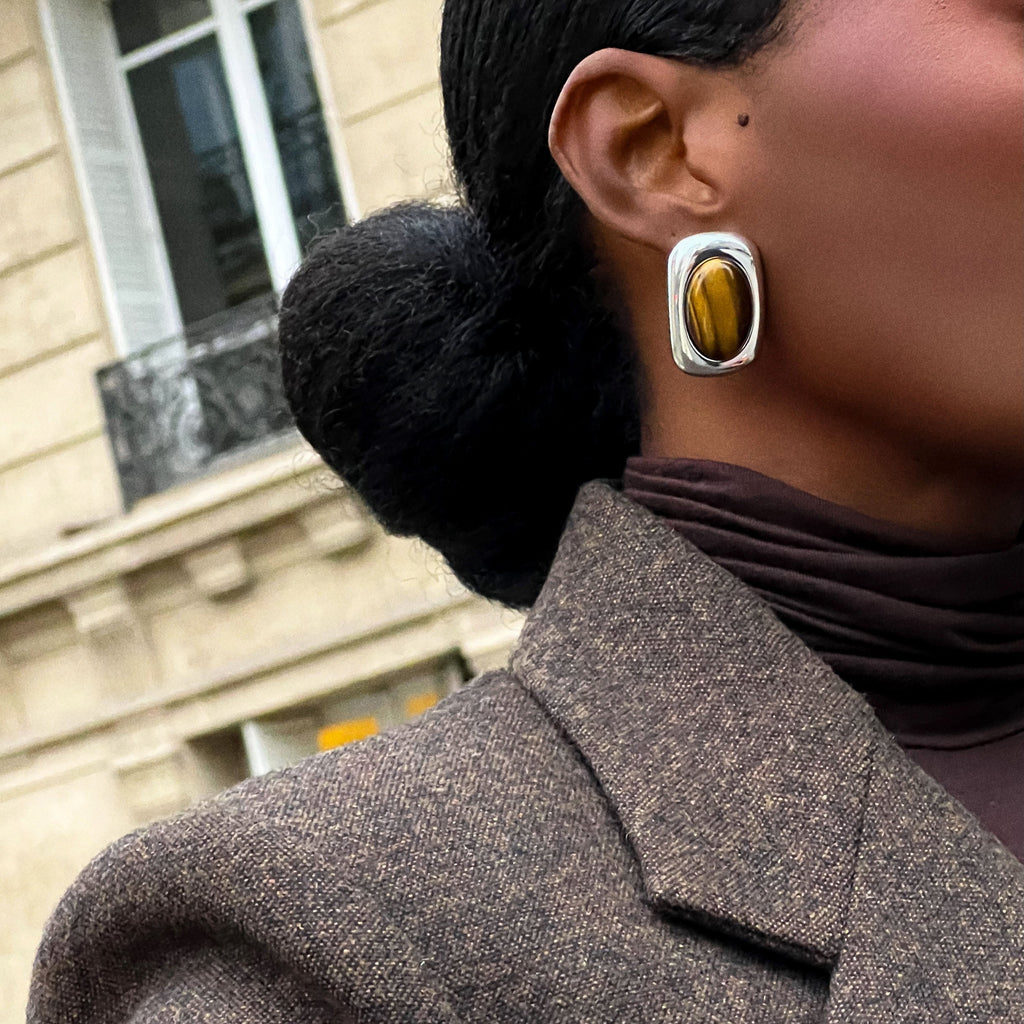 Conçues en collaboration avec Armelle Brown basé à Paris, ces boucles d'oreilles à clous d'inspiration vintage ornées d'une pierre œil-de-tigre ne manqueront pas de faire sensation !