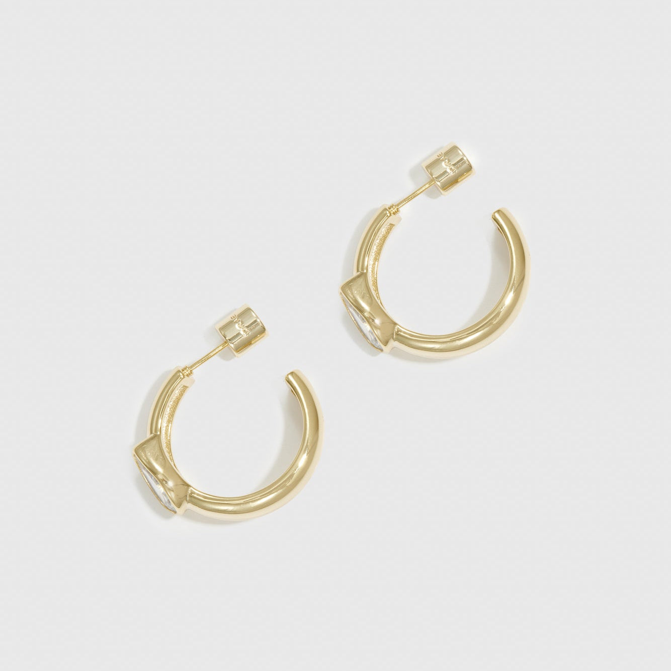 Each hoop features a precisely faceted teardrop gemstone that captures and reflects light with remarkable brilliance.